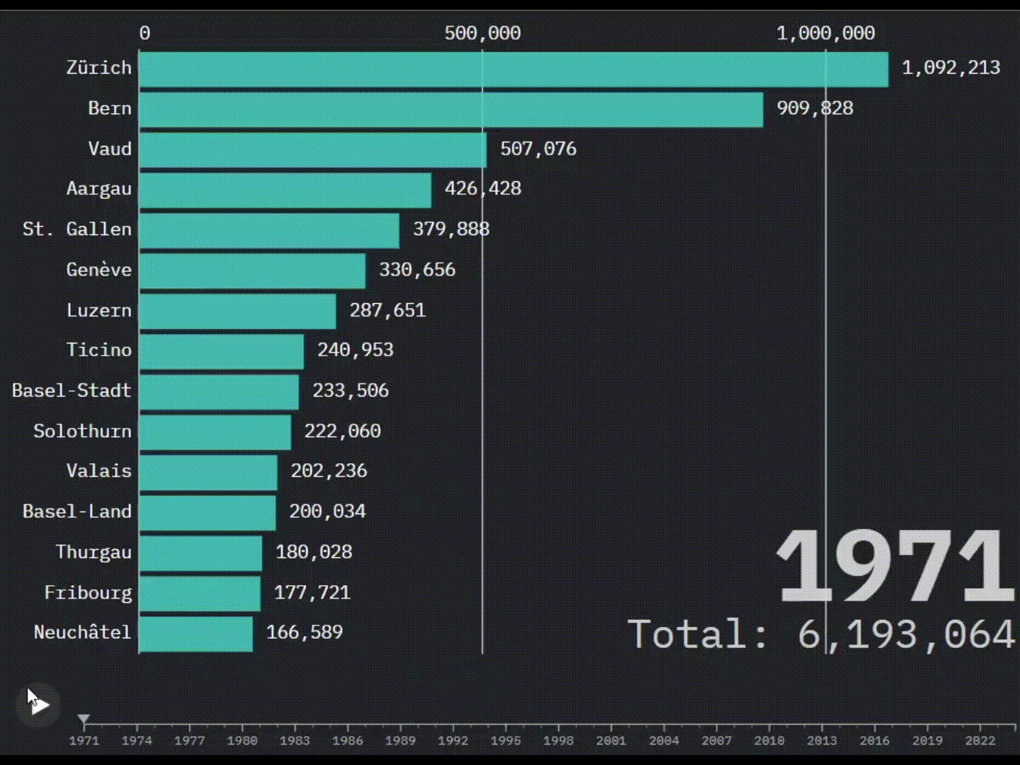 I also decided to stick with the same topic as last week – population. This time, I used population data by canton from the Swiss Federal Statistical Office, covering more than 50 years of data.