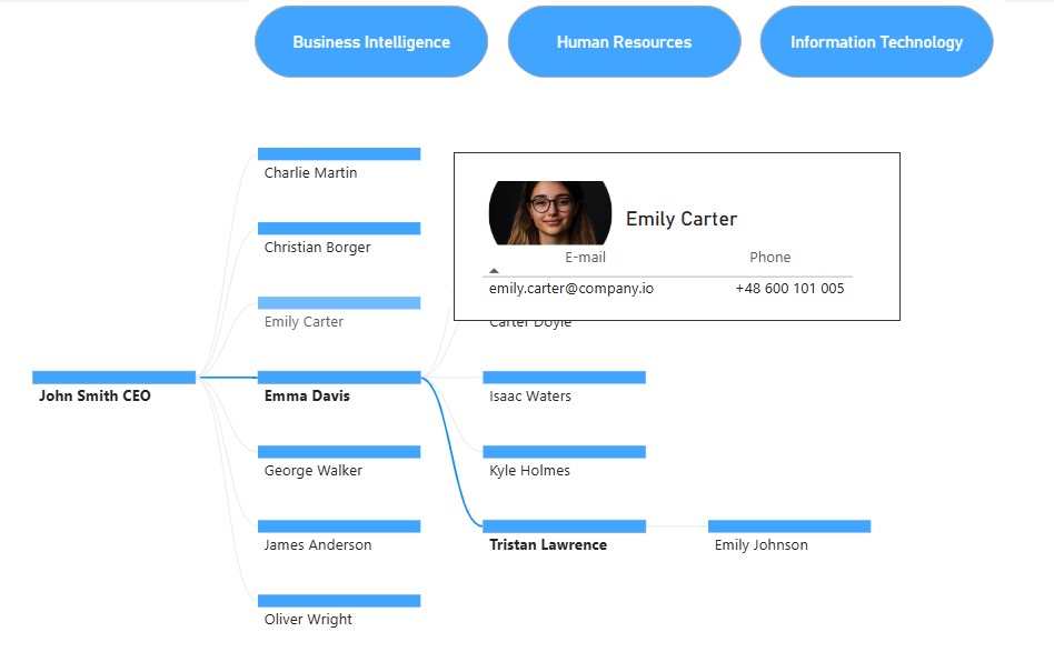 For this visualization, I used a dataset from datatraining.io, and I focused on showing an organizational structure. Having a decomposition tree of an organization is super helpful because it lets you quickly see how teams, roles, or departments are connected, who reports to whom, and where responsibilities are split.